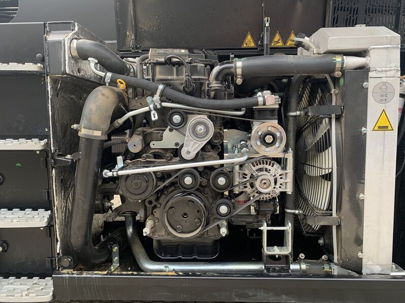 Einzelne Komponenten der Druckluftbremsanlage müssen in den engen Motorraum des Teleskopladers integriert werden, was verschiedene Anpassungsarbeiten erfordert, z. B. den Ersatz des Original-Lichtmaschinenhalters durch einen von Tietjen gefertigten Halter. Dieser neue Halter nimmt nicht nur die Lichtmaschine, sondern auch die Konsole für den Druckluftkompressor auf. So werden ein zusätzlicher Halter und damit Platz eingespart. Der Kompressor ist zwischen Yanmar-Motorblock und Kühler montiert, was eine besonders gute Kühlung des Kompressors gewährleistet.